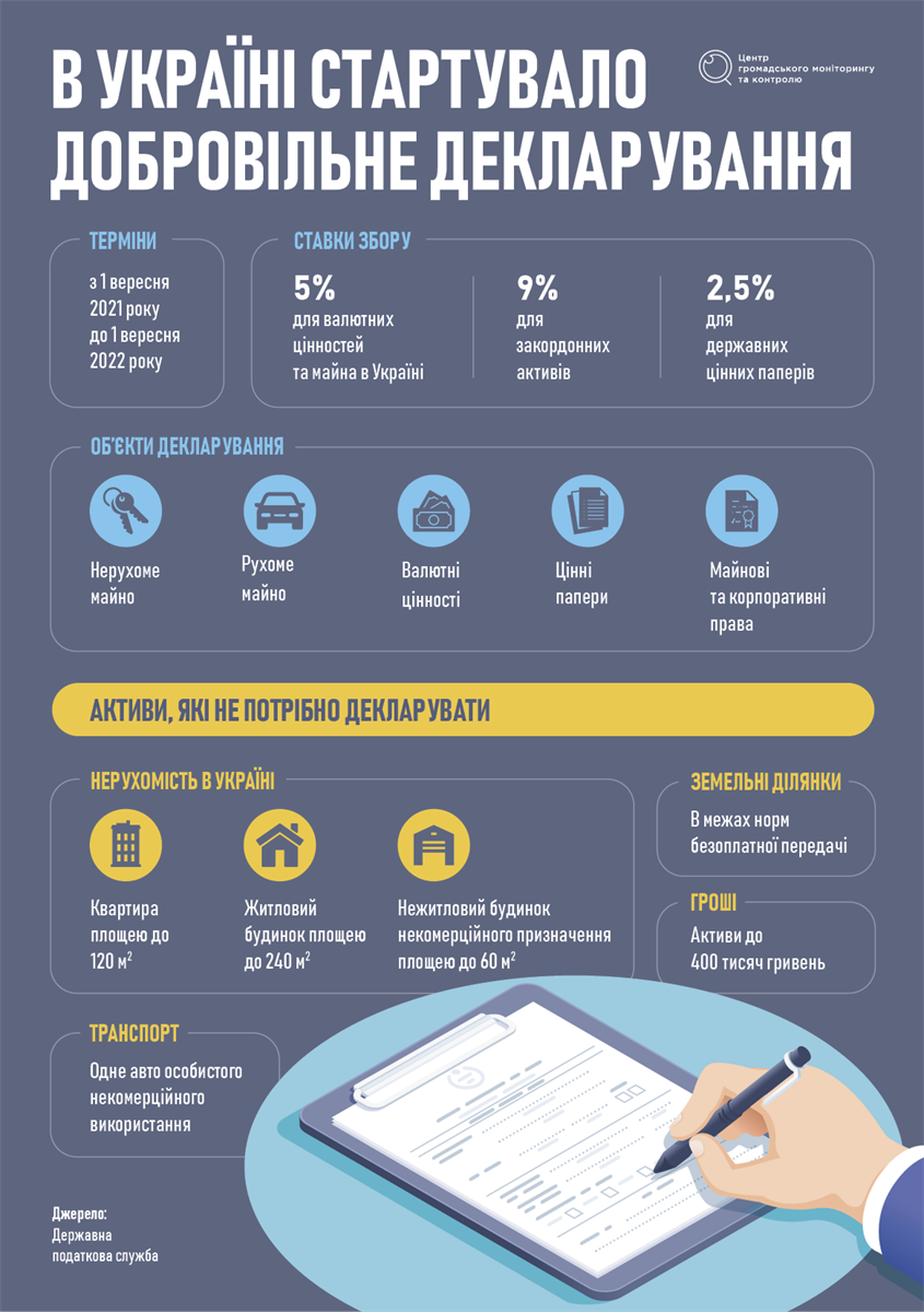 У вересні в Україні стартувало одноразове добровільне декларування. Це можливість для українців легалізувати кошти та майно, з яких не сплатили податки. Така податкова амністія триватиме рік і відбуватиметься онлайн. Кому і скільки доведеться заплатити, дізнавались експерти Центру громадського моніторингу та контролю.