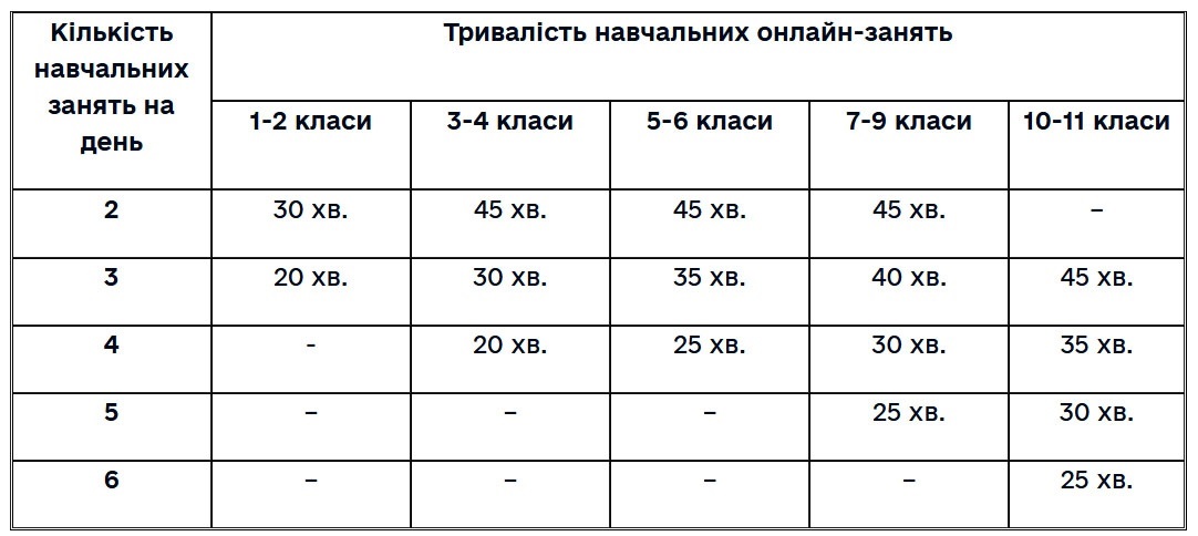 Зокрема, безперервна тривалість навчальної діяльності з ТЗН (онлайн) протягом навчального заняття для учнів: