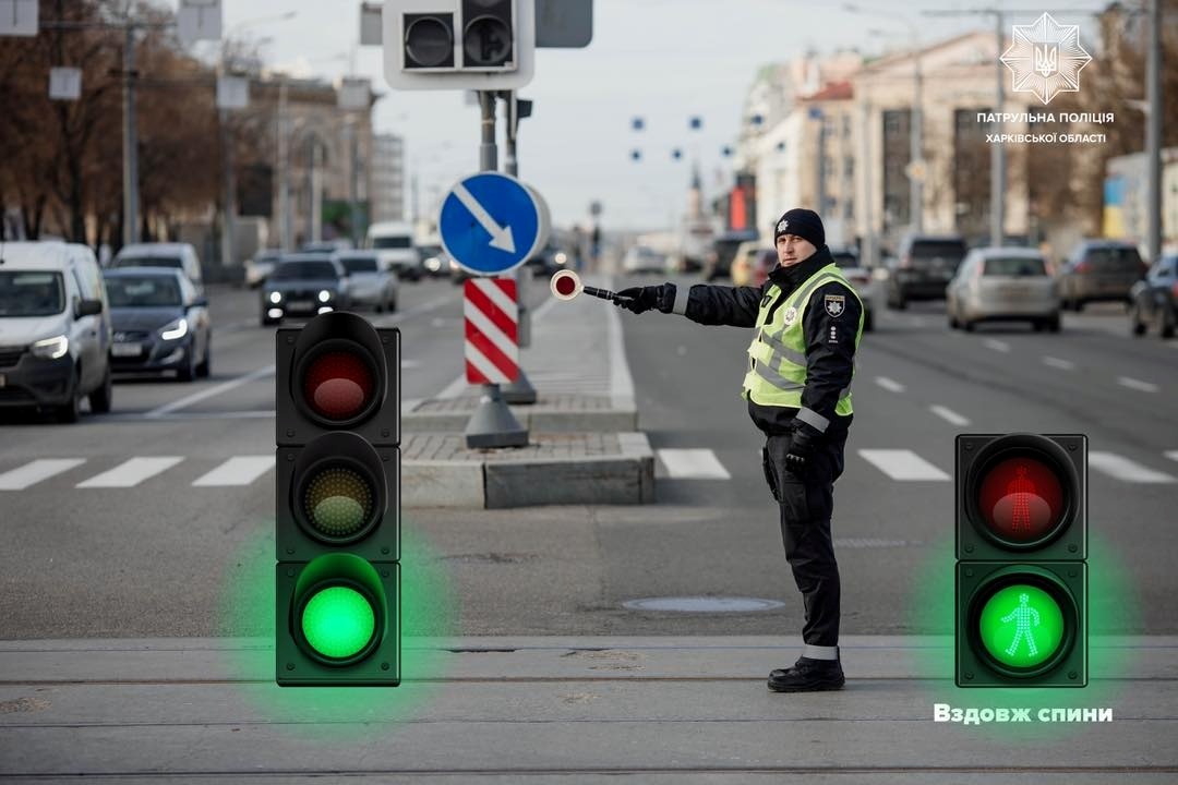 Патрульні поліцейські регулюють дорожній рух, щоб допомогти водіям безпечно проїхати, а пішоходам — перейти перехрестя
