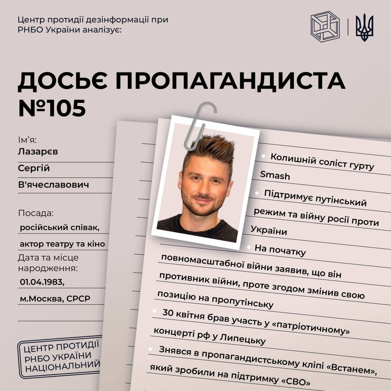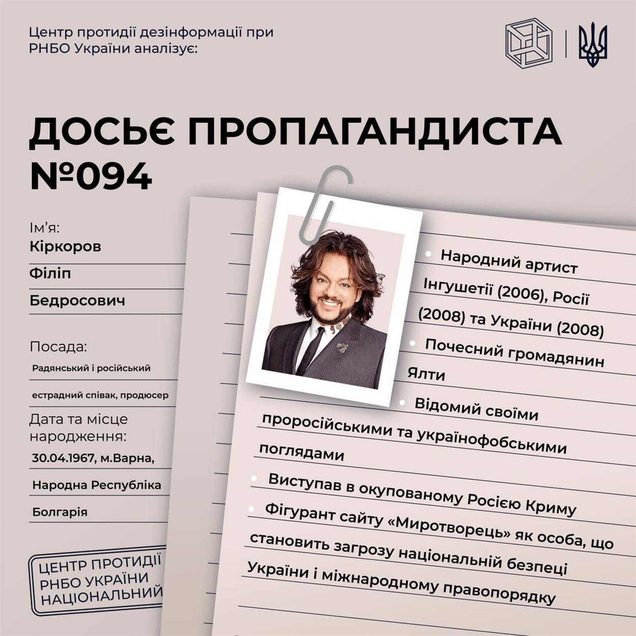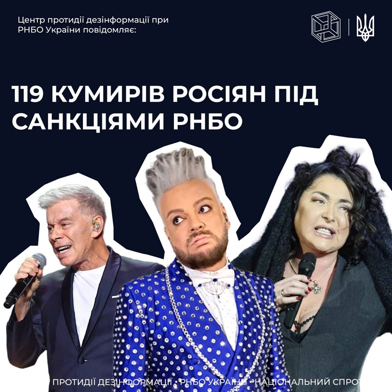 Рада національної безпеки та оборони України опублікувала рішення від 6 cічня 2023 року "Про застосування та внесення змін до персональних спеціальних економічних та інших обмежувальних заходів (санкцій)", введеного в дію Указом Президента України від 07.01.2023 №4/2023. Цим рішенням ввели санкції на російських пропагандистів, деяких з них знають усі українці, адже ще донедавна слухали їх музику чи дивилися їх виступи.