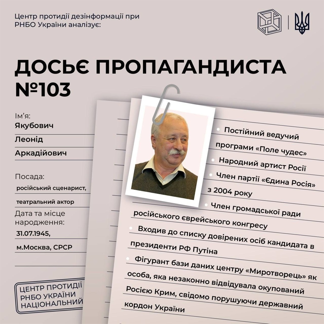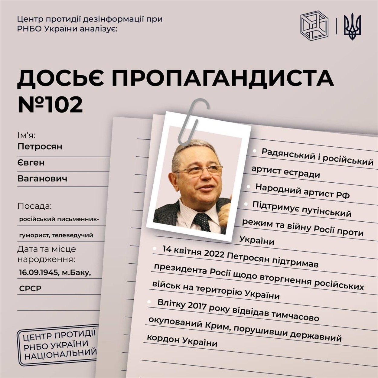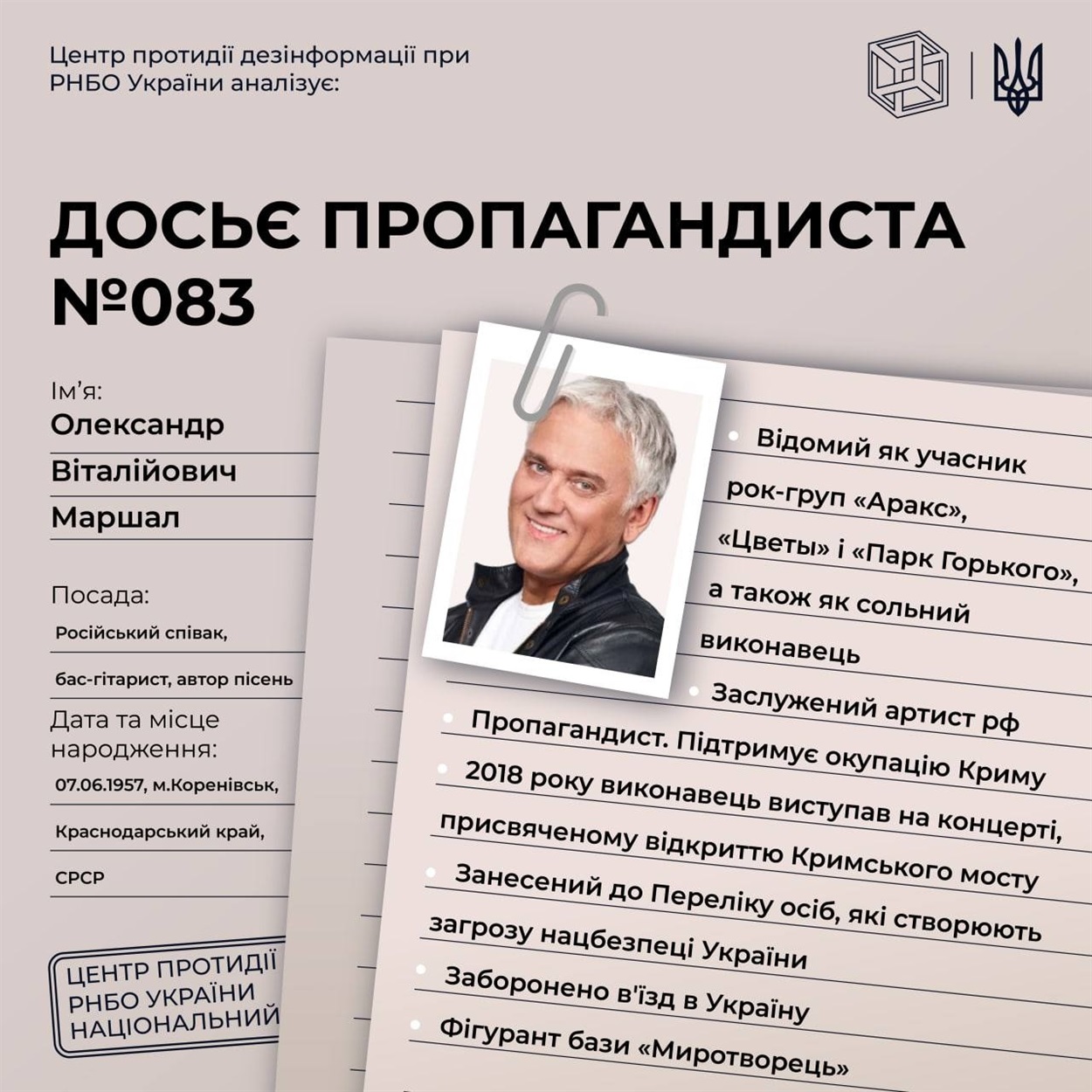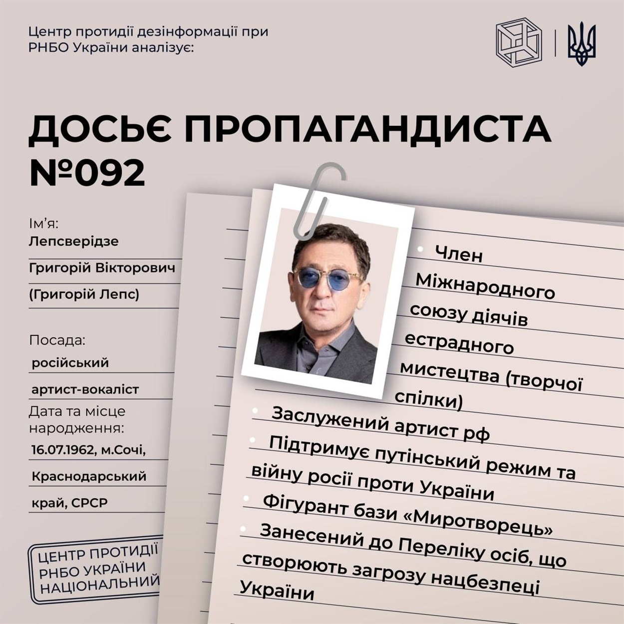 Рада національної безпеки та оборони України опублікувала рішення від 6 cічня 2023 року "Про застосування та внесення змін до персональних спеціальних економічних та інших обмежувальних заходів (санкцій)", введеного в дію Указом Президента України від 07.01.2023 №4/2023. Цим рішенням ввели санкції на російських пропагандистів, деяких з них знають усі українці, адже ще донедавна слухали їх музику чи дивилися їх виступи.