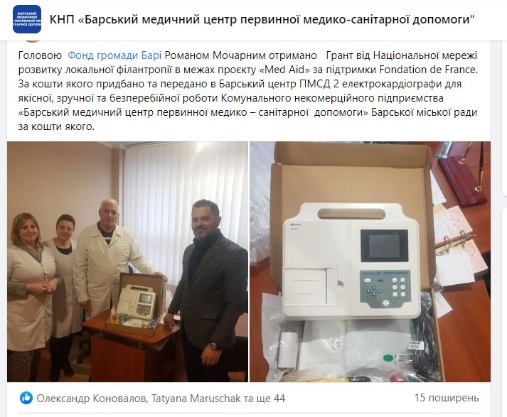 Фонд громади "Барі" для якісної, зручної та безперебійної роботи лікарів та створення комфортних умов для жителів Барської громади за грантові кошти закупив медичне приладдя за грантові кошти від Національної мережі розвитку локальної філантропії в межах проєкту «Med Aid» за підтримки Fondation de France.