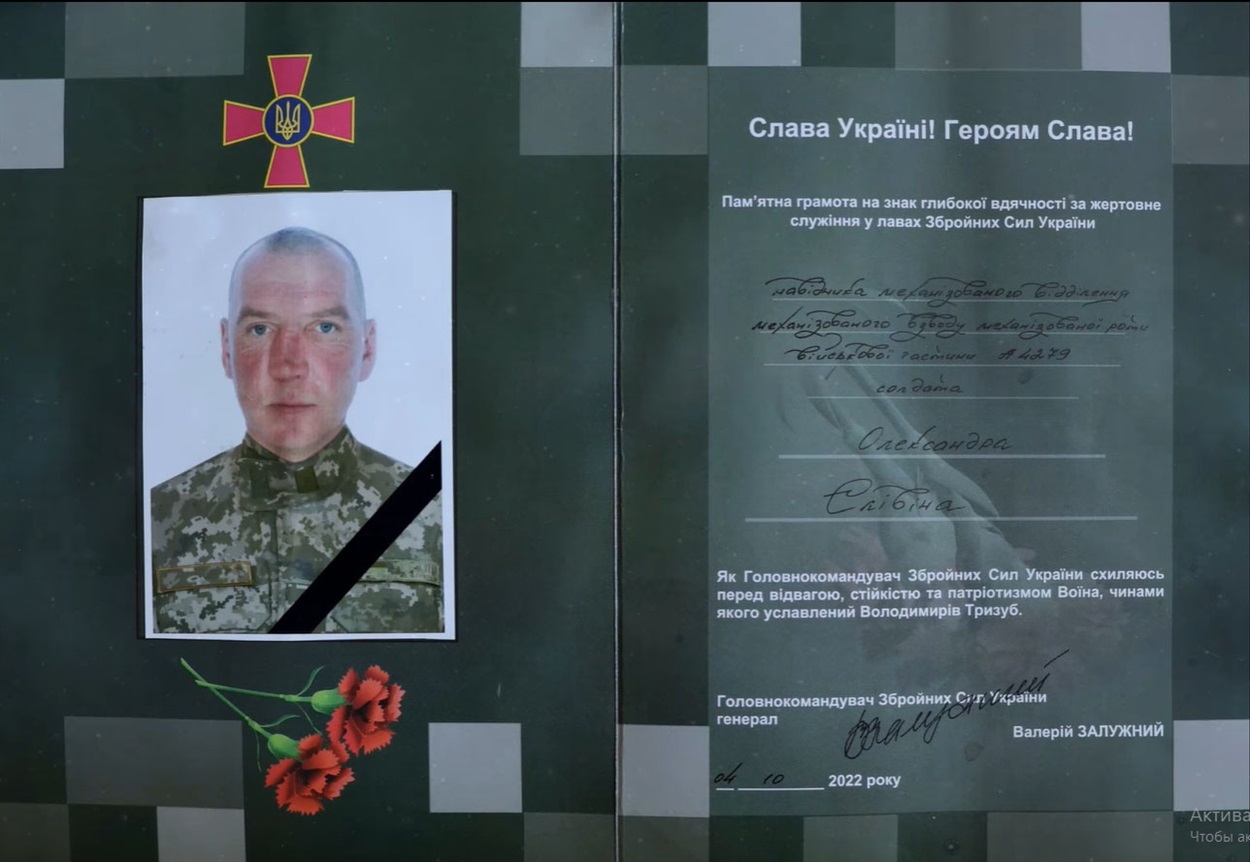 Сповнений справжньої мужності, самовідданості та непохитної вірності своїй країні, захищаючи її територіальну цілісність і мирне майбутнє для своїх співвітчизників, навідник механізованого відділення Олександр Слівін 4 жовтня 2022 року загинув під час виконання бойового завдання в районі н.п. Давидів Брід Великоолександрівського району Херсонської області.