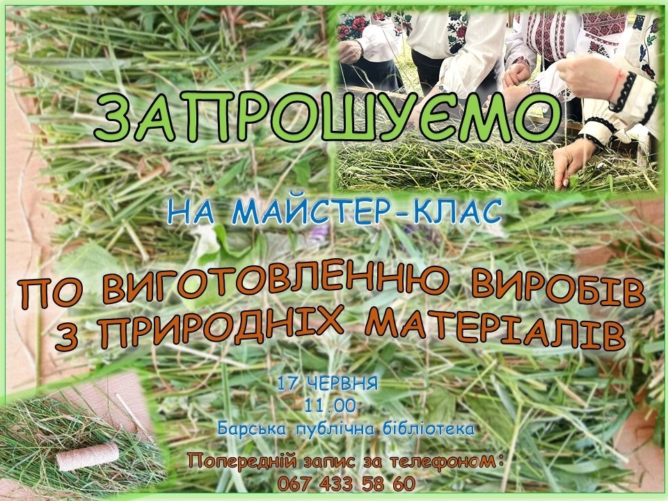 у Барській публічній бібліотеці 17 червня о 11.00 відбудеться майстер-клас із виготовлення виробів із природних матеріалів, зокрема сіна.