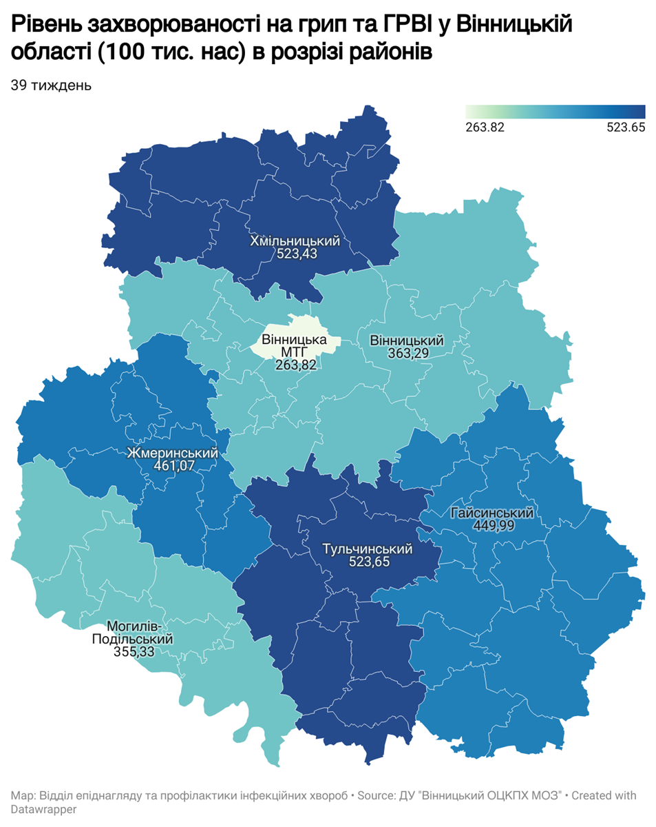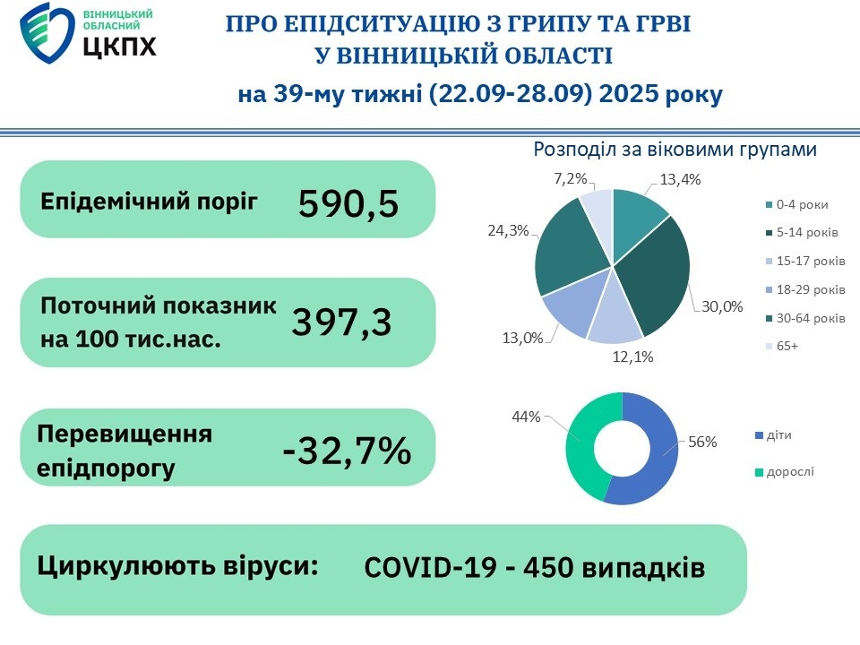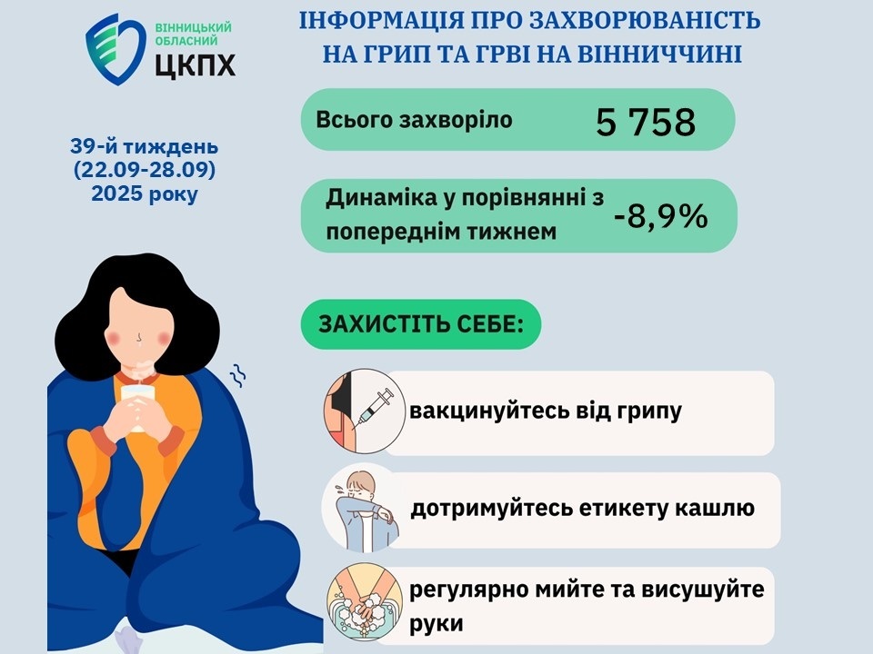 Вінницький обласний центр контролю та профілактики хвороб МОЗ України повідомив, що станом на 29 вересня 2025 року (дані за період з 22 по 28 вересня) в області на грип та ГРВІ захворіло 5 758 осіб. Це на 8,9% менше, ніж тижнем раніше.