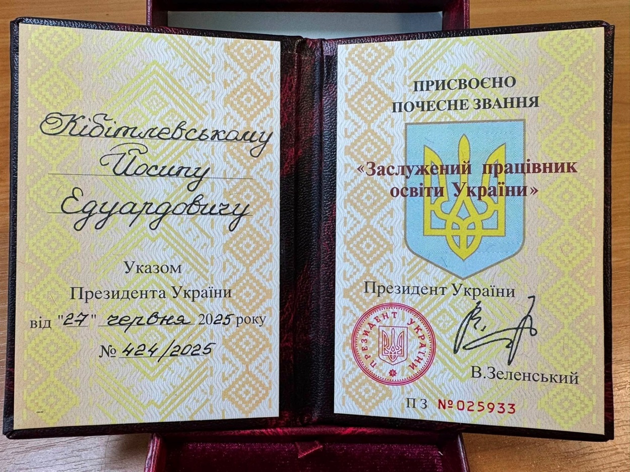 «Висока державна нагорода, присвоєна мені Указом Президента України від 27 червня 2025 року № 424/2025, є особливо значущою, адже підсумовує не лише мою багатолітню працю, а й спільні зусилля всього колективу ВСП "Барський фаховий коледж транспорту та будівництва НТУ" у творенні якісного і сучасного освітнього простору, у вихованні гідного майбутнього України», - зазначив Йосип Кібітлевський.
