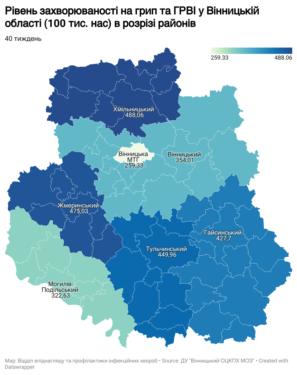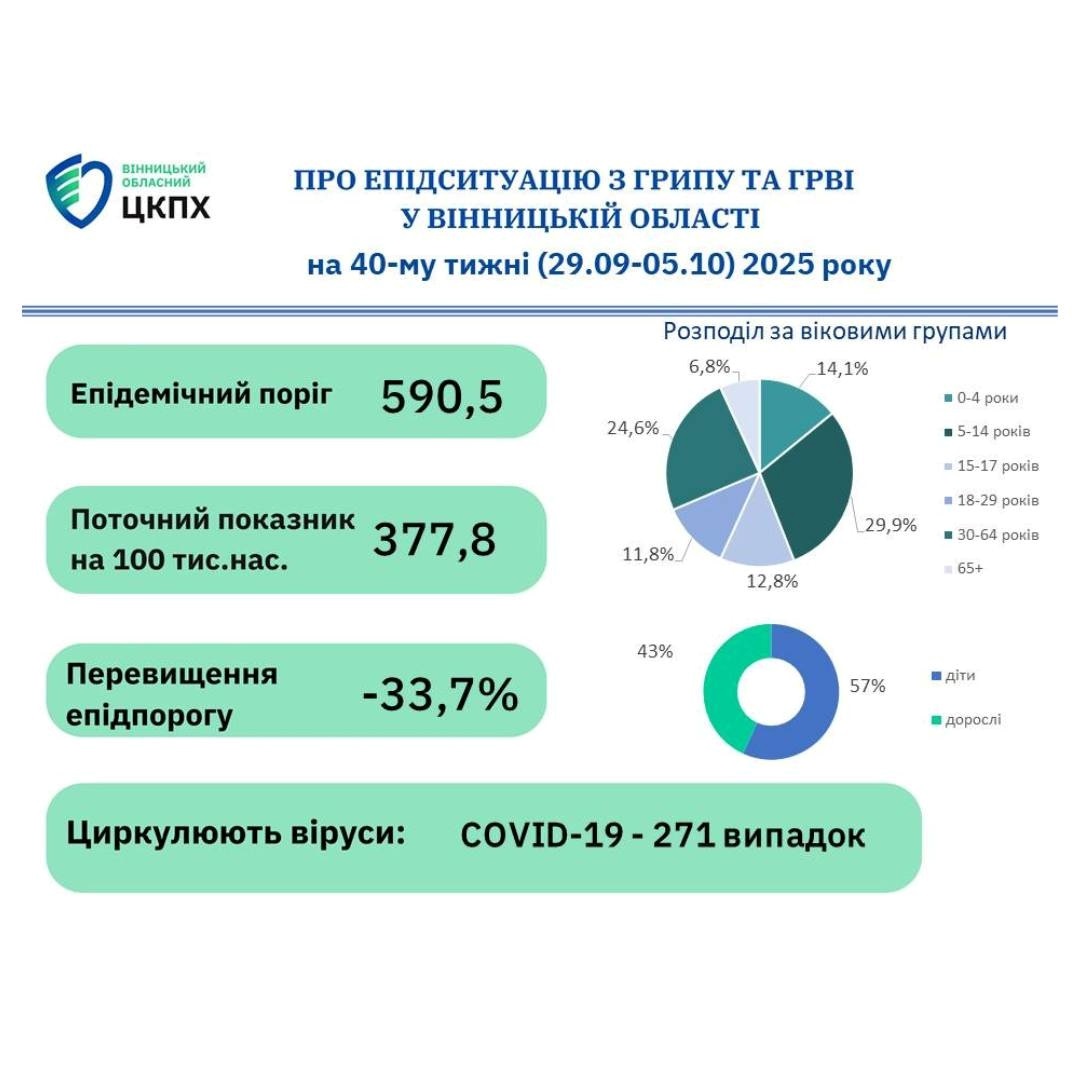 За даними Вінницького обласного центру контролю та профілактики хвороб МОЗ України, всього на грип та гострі респіраторні вірусні інфекції у Вінницькій області захворіло 5 476 осіб. Це на 5 % менше, ніж попереднього тижня.