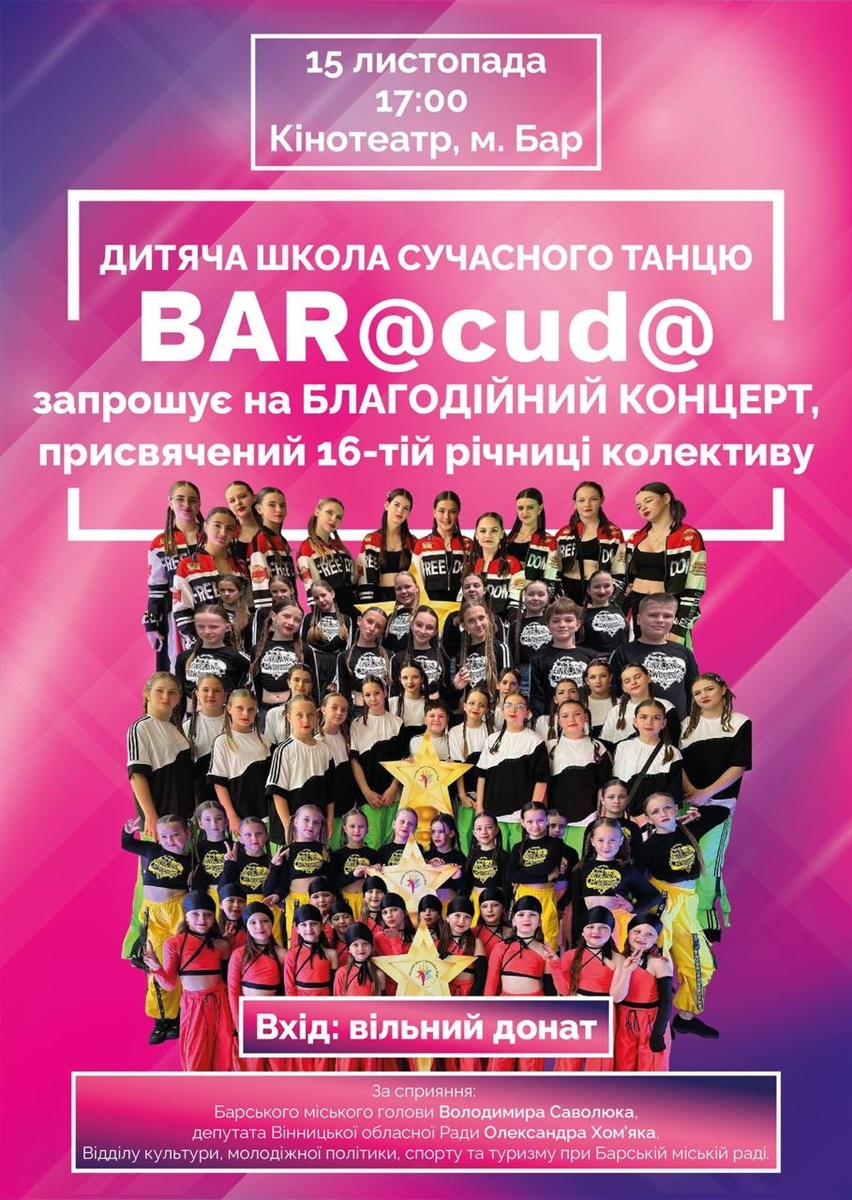 Дитяча школа сучасного танцю BAR@cud@ запрошує на благодійний концерт, присвячений 16-й річниці колективу.