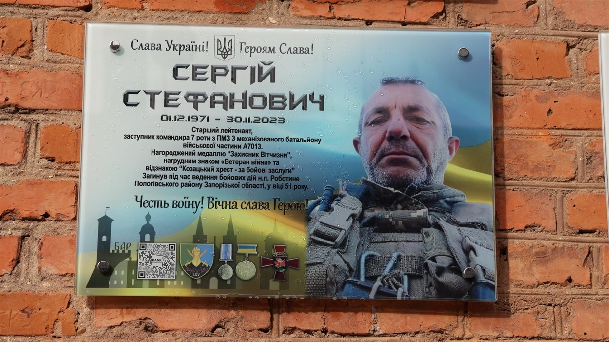 На території Барського ліцею №2 14 листопада відбулося урочисте відкриття Меморіальної дошки Сергію Стефановичу — випускнику закладу, воїну, який героїчно загинув за Україну. Про це повідомляє Барська міська рада.
