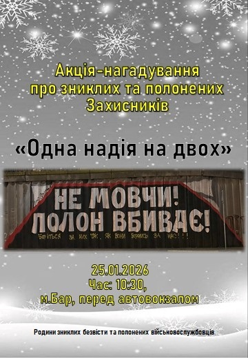 У місті Бар 25 січня 2026 року відбудеться акція-нагадування про зниклих безвісти та полонених українських Захисників під назвою «Одна надія на двох».