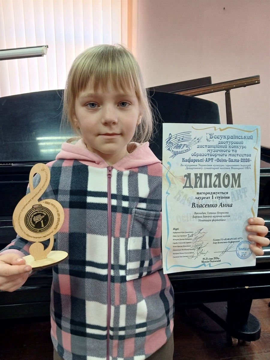Учениця 2 класу Барської музичної школи Власенко Анна стала лауреаткою І премії Всеукраїнського двотурового конкурсу «Кафарські-АРТ. Осінь-зима – 2026». Про це повідомляє музична школа.