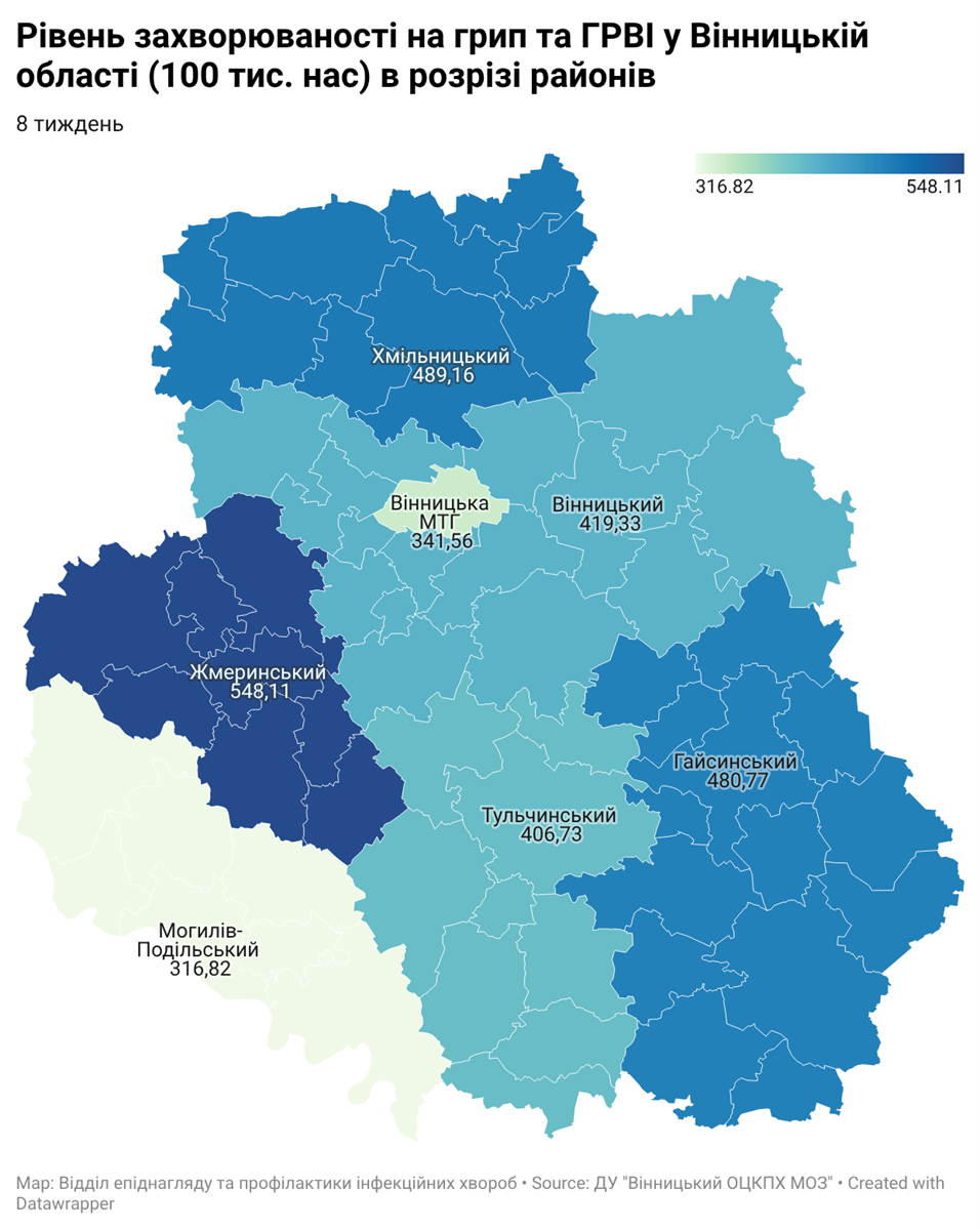 Найвищий рівень захворюваності зафіксовано у Жмеринському районі — 548,11 на 100 тисяч населення. Це найближчий до епідемічного порогу показник в області.