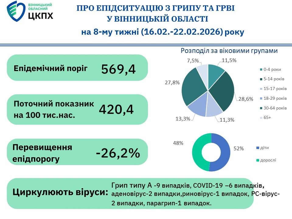 Про це свідчать дані Вінницького обласного центру контролю та профілактики хвороб МОЗ України за 8-й тиждень 2026 року — з 16 по 22 лютого.