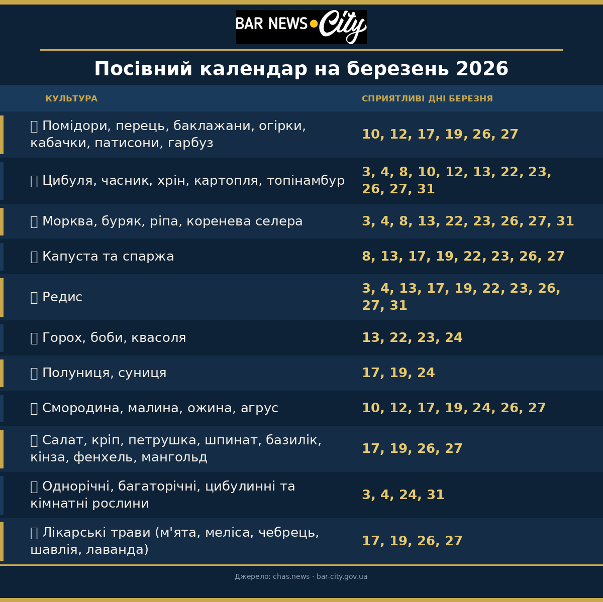 - Цибуля, часник, хрін, картопля, топінамбур - 3, 4, 8, 10, 12, 13, 22, 23, 26, 27, 31.