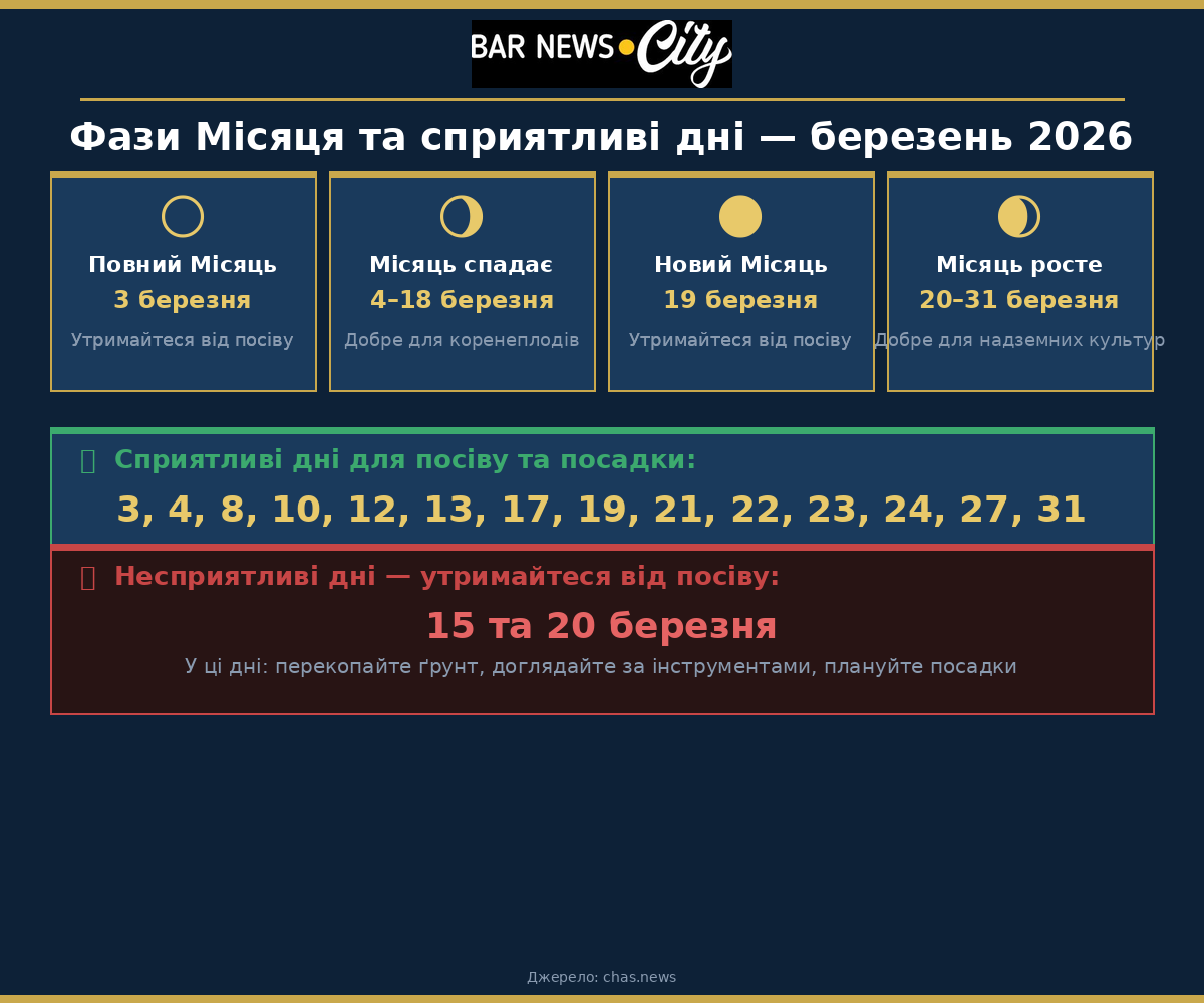 Несприятливі дні для посіву: 15 та 20 березня. У ці дні краще перекопати ґрунт, підготувати інструменти або спланувати подальші посадки.