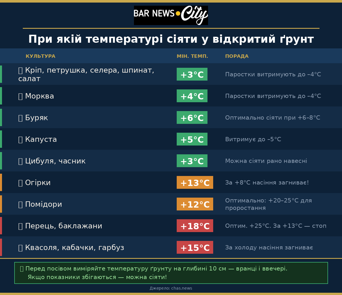 Кріп, петрушка, селера, шпинат, салат — від +3°С. Насіння петрушки і селери проростає вже за 2–4°С, а паростки витримують заморозки до –4°С.