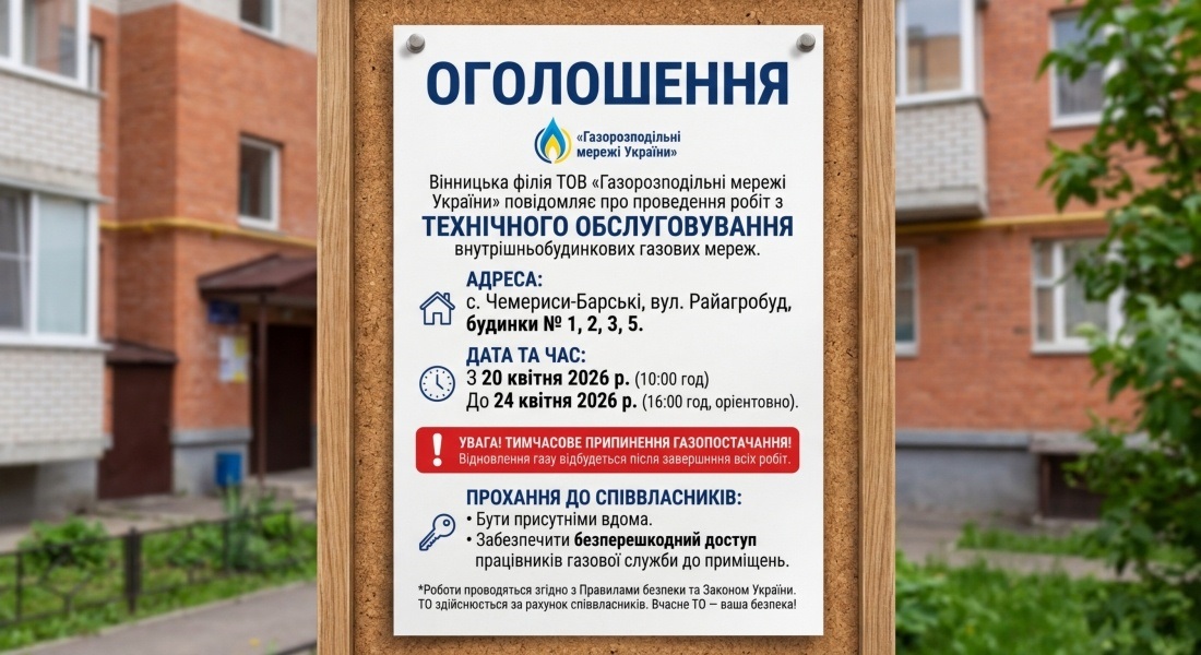 Вінницька філія ТОВ «Газорозподільні мережі України» повідомляє про технічне обслуговування внутрішньобудинкових газових мереж у будинках №1, 2, 3, 5 по вулиці Райагробуд у селі Чемериси-Барські.