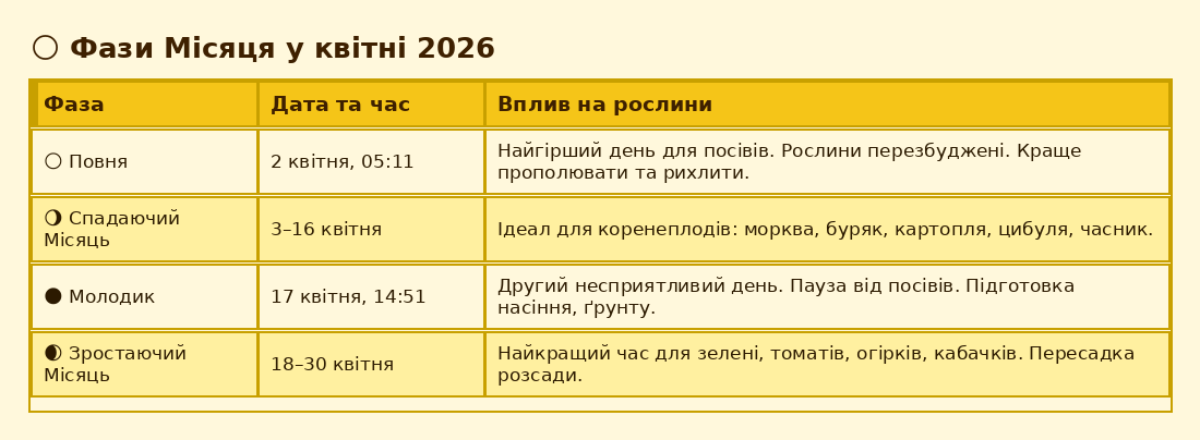- 2 квітня — Повня (05:11): рослини в стресі, сходи слабкі