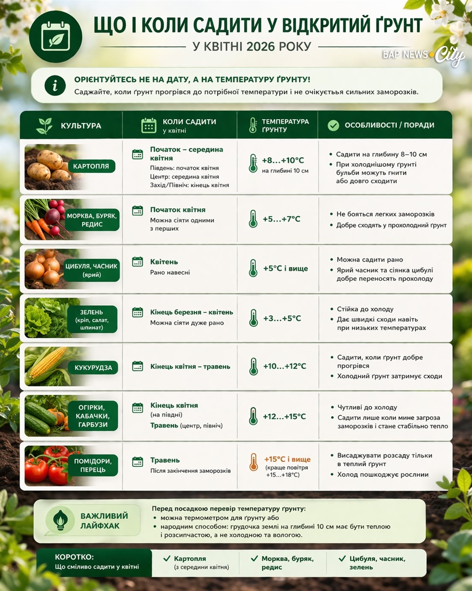 Квітень — перший справді «польовий» місяць. Але поспіх тут шкідливий: більшість теплолюбних культур іще не виходить у відкритий ґрунт. Орієнтуйтесь на температуру ґрунту, а не лише на дату: холодостійким культурам потрібно від +5°C, теплолюбним — від +12–15°C.