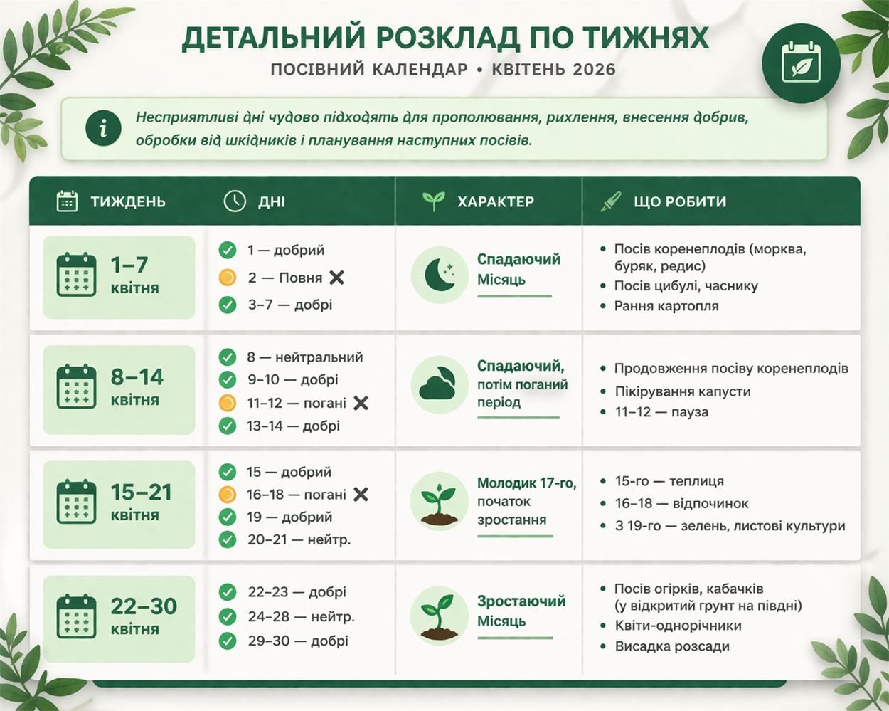 У цьому матеріалі ви знайдете сприятливі й несприятливі дні квітня 2026 з урахуванням фаз Місяця, детальний розклад посівів у відкритий ґрунт і в теплицю, терміни пікірування розсади, план садових робіт, таблиці сумісності рослин і принципи правильної сівозміни.