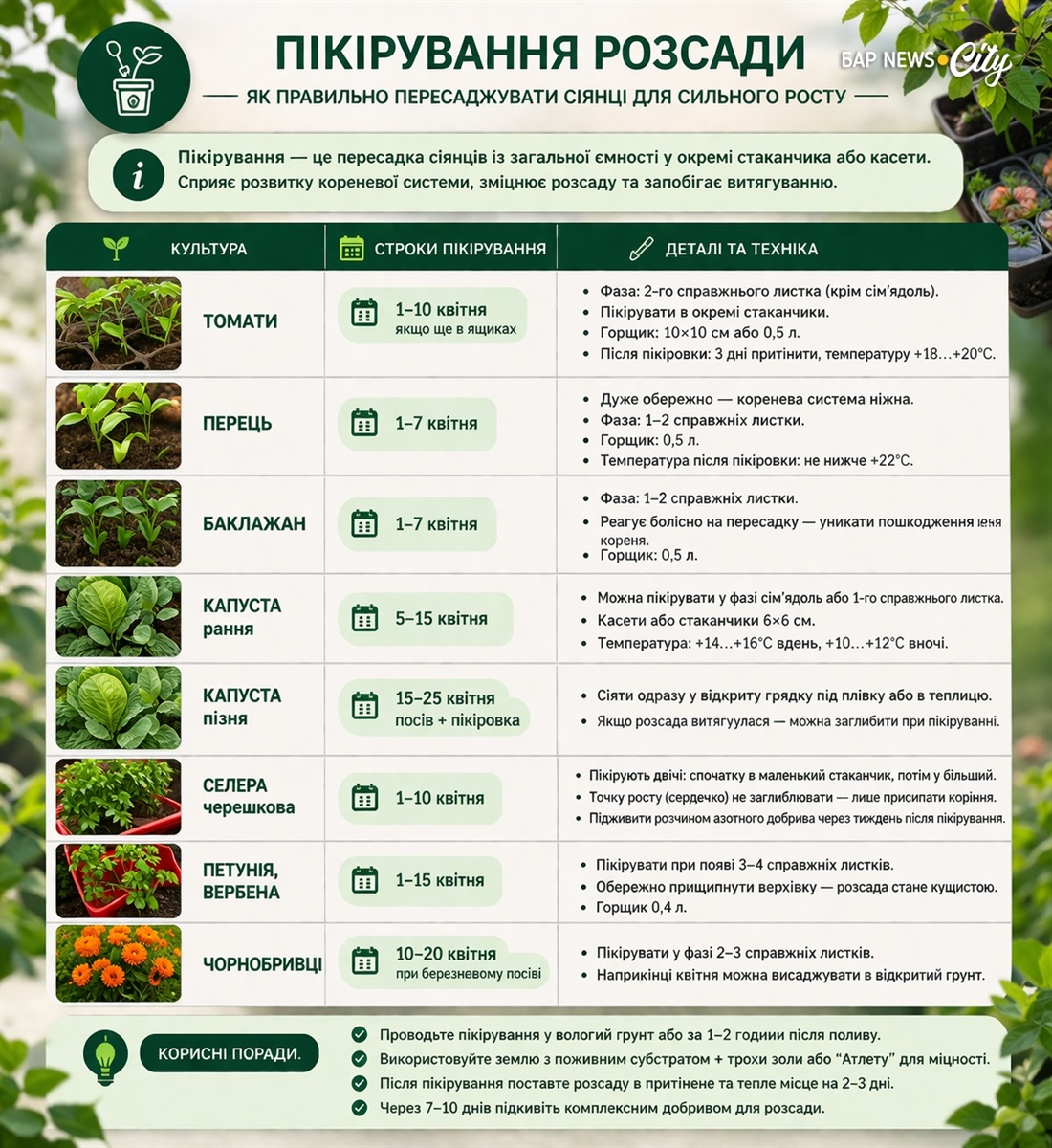 Пікірування та догляд за розсадою у квітні