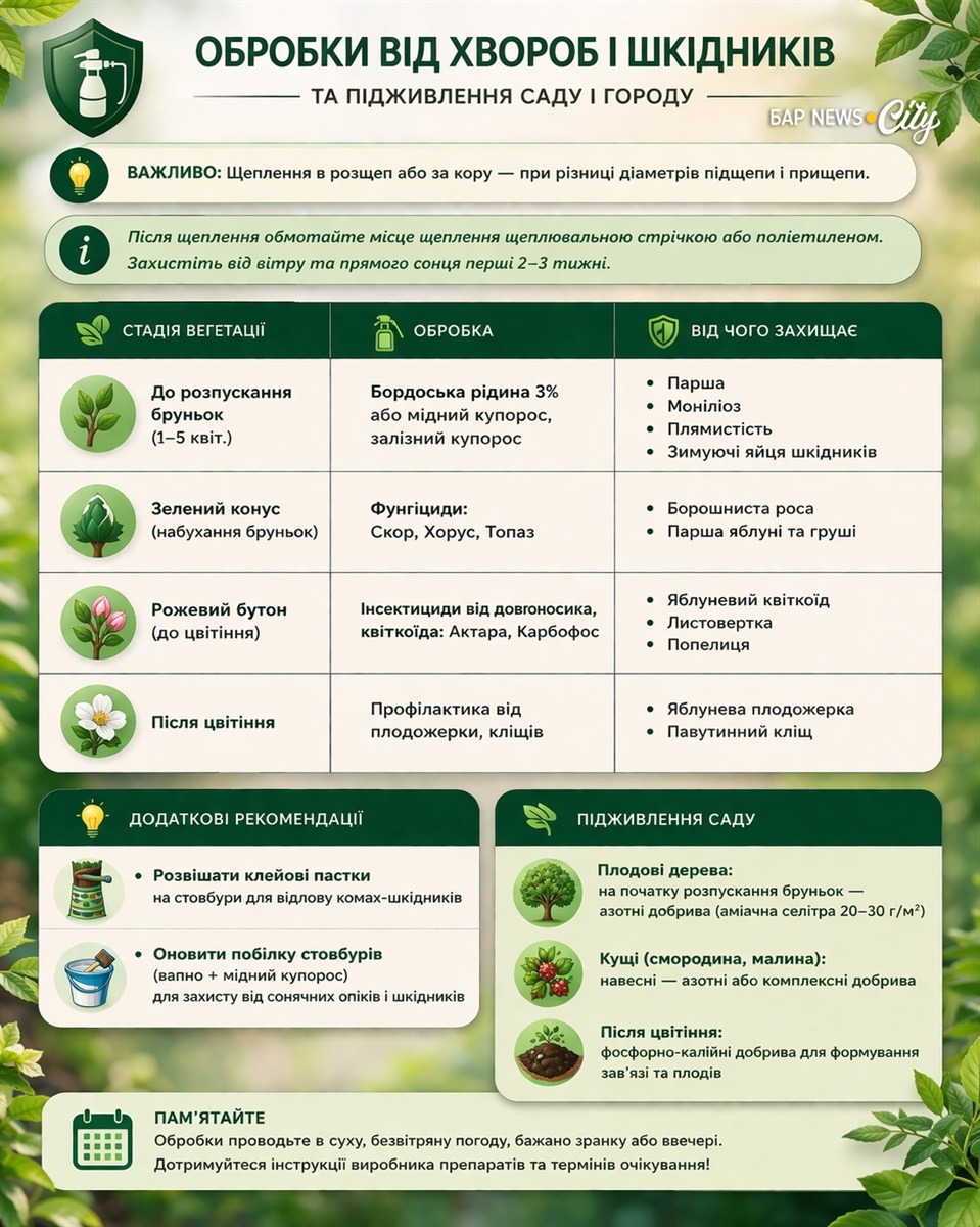 Поки городник метушиться з розсадою, сад теж потребує уваги. Квітень — останній шанс обрізати плодові дерева до активного сокоруху, пора першого обприскування від хвороб і ідеальний час для щеплення. Не відкладайте ці роботи: тиждень зволікання навесні може коштувати частини врожаю.