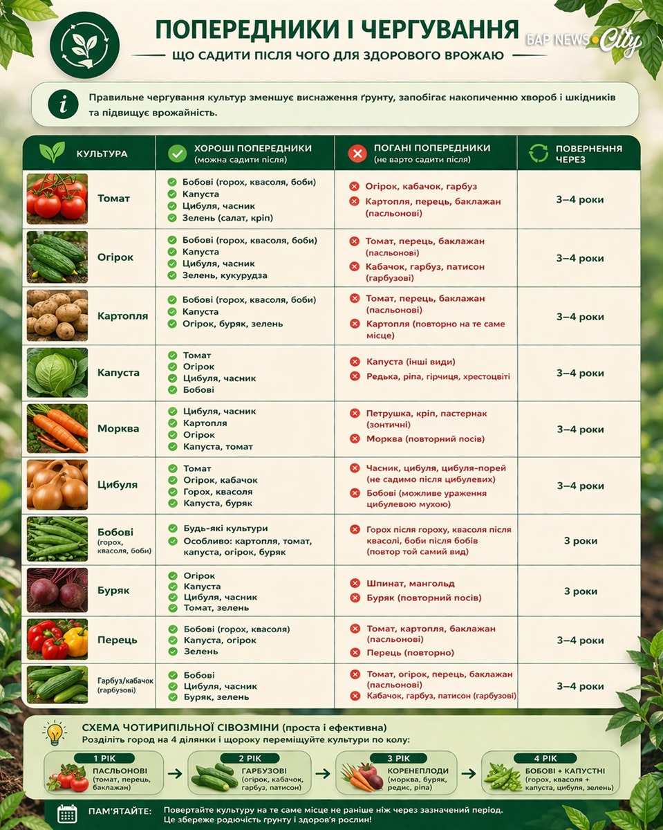 - Схожі шкідники та хвороби передаються в ґрунт — розривайте цикл чергуванням.