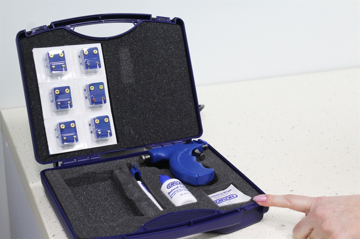 Лікар-дерматолог спеціальним приладдям пробиває вушка малюкам і дорослим.